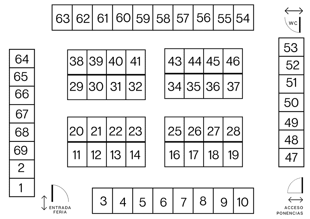 Espacios modulares 3×3 en el Recinto Ferial, equipados con tomas eléctricas y mobiliario básico.